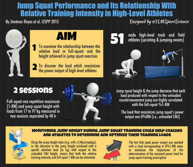 Purpose: To examine the relationship between the relative load in full squats and the height achieved in jump-squat (JS) exercises and to determine the load that maximizes the power output of high-level athletes. Method: Fifty-one male high-level track-and-field athletes (age 25.2 ± 4.4 y, weight 77. ± 6.2 kg, height 179.9 ± 5.6 cm) who competed in sprinting and jumping events took part in the study. Full-squat 1-repetition-maximum (1-RM) and JS height (JH) with loads from 17 to 97 kg were measured in 2 sessions separated by 48 h. Results: Individual regression analyses showed that JH (R2 = .992 ± .005) and the jump decrease (JD) that each load produced with respect to the unloaded countermovement jump (CMJ) (R2 = .992 ± 0.007) are highly correlated with the full-squat %1-RM, which means that training intensities can be prescribed using JH and JD values. The authors also found that the load that maximizes JS`s power output was 0%RM (ie, unloaded CMJ). Conclusions: These results highlight the close relationship between JS performance and relative training intensity in terms of %1-RM. The authors also observed that the load that maximizes power output was 0%1-RM. Monitoring jump height during JS training could help coaches and athletes determine and optimize their training loads.