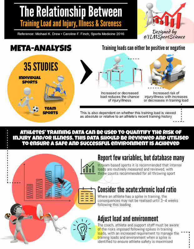 Implications: The training load applied to an athlete appears to be related to their risk of injury and/or illness. Sports science and medicine professionals working with athletes should monitor this load and avoid acute spikes in loads. It is recommended that internal load as the product of the rate of perceived exertion (10-point modified Borg) and duration be used when determining injury risk in team-based sports. External loads measured as throw counts should also be monitored and collected across a season to determine injury risk in throwing populations. Global positioning system-derived distances should be utilised in team sports, and injury monitoring should occur for at least 4 weeks after spikes in loads.