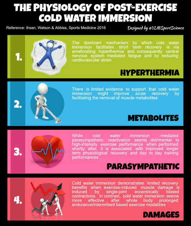 Intense training results in numerous physiological perturbations such as muscle damage, hyperthermia, dehydration and glycogen depletion. Insufficient/untimely restoration of these physiological alterations might result in sub-optimal performance during subsequent training sessions, while chronic imbalance between training stress and recovery might lead to overreaching or overtraining syndrome. The use of post-exercise cold water immersion (CWI) is gaining considerable popularity among athletes to minimize fatigue and accelerate post-exercise recovery. CWI, through its primary ability to decrease tissue temperature and blood flow, is purported to facilitate recovery by ameliorating hyperthermia and subsequent alterations to the central nervous system (CNS), reducing cardiovascular strain, removing accumulated muscle metabolic by-products, attenuating exercise-induced muscle damage (EIMD) and improving autonomic nervous system function. The current review aims to provide a comprehensive and detailed examination of the mechanisms underpinning acute and longer term recovery of exercise performance following post-exercise CWI. Understanding the mechanisms will aid practitioners in the application and optimisation of CWI strategies to suit specific recovery needs and consequently improve athletic performance. Much of the literature indicates that the dominant mechanism by which CWI facilitates short term recovery is via ameliorating hyperthermia and consequently CNS mediated fatigue and by reducing cardiovascular strain. In contrast, there is limited evidence to support that CWI might improve acute recovery by facilitating the removal of muscle metabolites. CWI has been shown to augment parasympathetic reactivation following exercise. While CWI-mediated parasympathetic reactivation seems detrimental to high-intensity exercise performance when performed shortly after, it has been shown to be associated with improved longer term physiological recovery and day to day training performances. The efficacy of CWI for attenuating the secondary effects of EIMD seems dependent on the mode of exercise utilised. For instance, CWI application seems to demonstrate limited recovery benefits when EIMD was induced by single-joint eccentrically biased contractions. In contrast, CWI seems more effective in ameliorating effects of EIMD induced by whole body prolonged endurance/intermittent based exercise modalities.