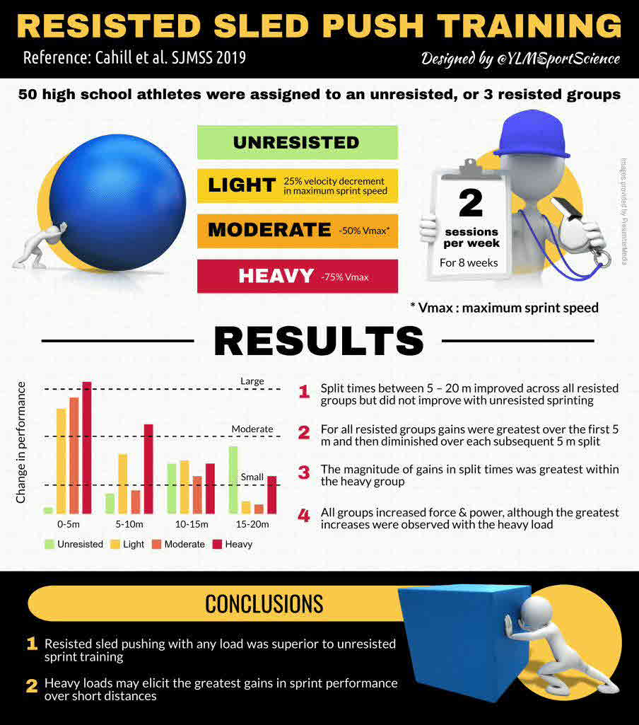 Sled pushing is a commonly used form of resisted sprint training, however little empirical evidence exists, especially in youth populations. The aim of this study was to assess the effectiveness of unresisted and resisted sled pushing across multiple loads. Fifty high school athletes were assigned to an unresisted (n=12), or 3 resisted groups; light (n=14), moderate (n=13) and heavy (n=11) resistance that caused a 25, 50 and 75% velocity decrement in maximum sprint speed, respectively. All participants performed two sled push training sessions twice weekly for 8 weeks. Before and after the training intervention, the participants performed a series of jump, strength and sprint testing to assess athletic performance. Split times between 5 - 20 m improved significantly across all resisted groups (all p<0.05, d = 0.34 - 1.16) but did not improve significantly with unresisted sprinting. For all resisted groups gains were greatest over the first 5 m (d = 0.67-0.84) and then diminished over each subsequent 5 m split (d = 0.08-0.57). The magnitude of gains in split times was greatest within the heavy group. Small but non-significant within group effects were found in pre to post force-velocity profiles. There was a main effect of time but no interaction effects as all groups increased force and power, although the greatest increases were observed with the heavy load (d = 0.50-0.51). The results of this study suggest that resisted sled pushing with any load was superior to unresisted sprint training, and that heavy loads may elicit the greatest gains in sprint performance over short distances.