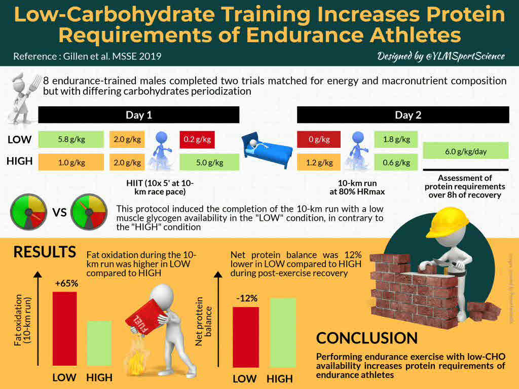 INTRODUCTION: Training with low-carbohydrate (CHO) availability enhances markers of aerobic adaptation and has become popular to periodize throughout an endurance-training program. However, exercise-induced amino acid oxidation is increased with low muscle glycogen, which may limit substrate availability for postexercise protein synthesis. We aimed to determine the impact of training with low-CHO availability on estimates of dietary protein requirements.