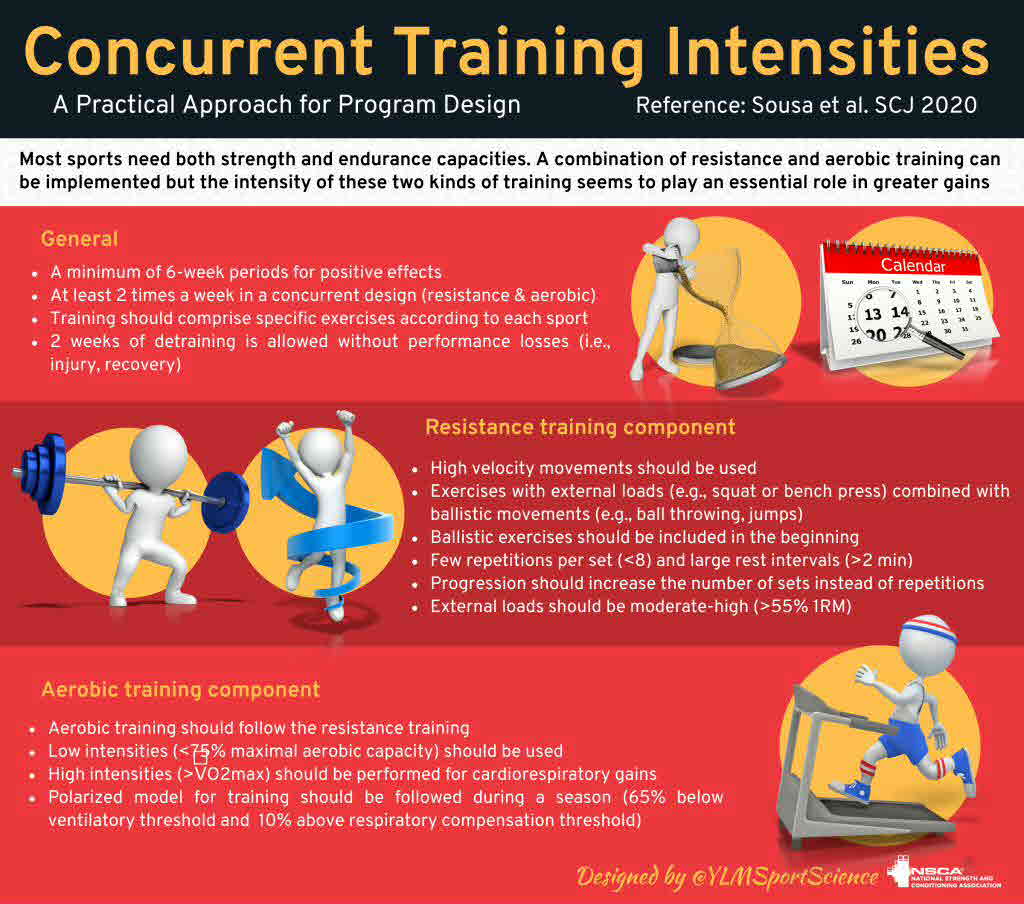 Sports performance is influenced by the interaction of several physical variables. For this reason, most sports need both strength and endurance capacities to maximize overall performance. Therefore, a combination of resistance and aerobic training, usually called concurrent training (CT), has been used recently as a way of simultaneously improving strength and aerobic performances according to the needs of a specific sport. This combination can be challenging and can influence training adaptations, being a problematic issue for coaches. The main objective is to provide coaches with a practical proposal for CT to improve athletes' performance in different sports.