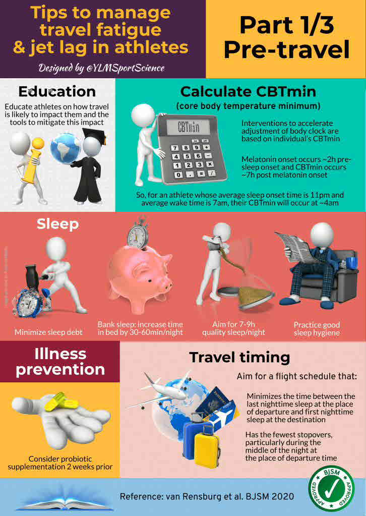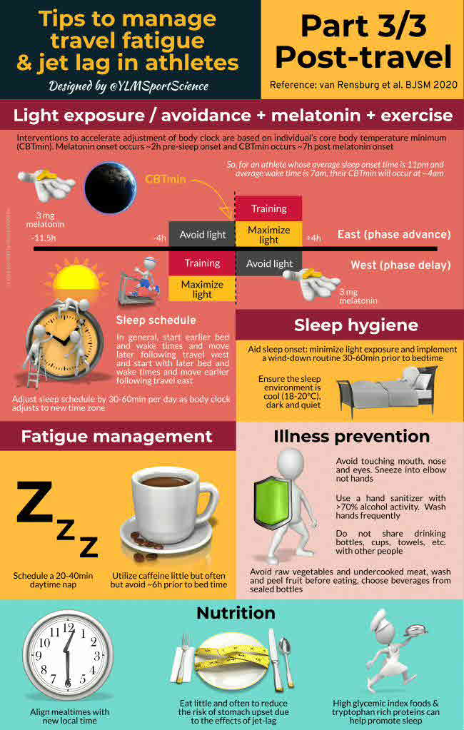 We investigated the management of travel fatigue and jet lag in athlete populations by evaluating studies that have applied non-pharmacological interventions (exercise, sleep, light and nutrition), and pharmacological interventions (melatonin, sedatives, stimulants, melatonin analogues, glucocorticoids and antihistamines) following long-haul transmeridian travel-based, or laboratory-based circadian system phase-shifts.