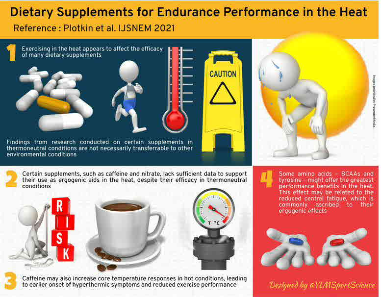 Conclusion: Supplements such as caffeine and nitrates do not enhance endurance performance in the heat, with caffeine also increasing core temperature responses. Some amino acids might offer the greatest performance benefits in the heat. Exercising in the heat negatively affected the efficacy of many dietary supplements, indicating that further research is needed and current guidelines for performance in hot environments likely require revision.