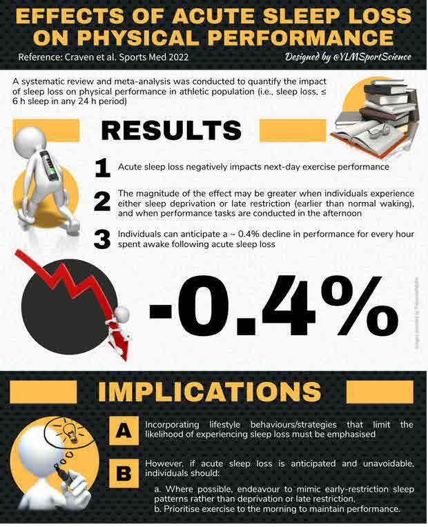 Conclusions: Sleep loss appears to have a negative impact on exercise performance. If sleep loss is anticipated and unavoidable, individuals should avoid situations that lead to experiencing deprivation or late restriction, and prioritise morning exercise in an effort to maintain performance.