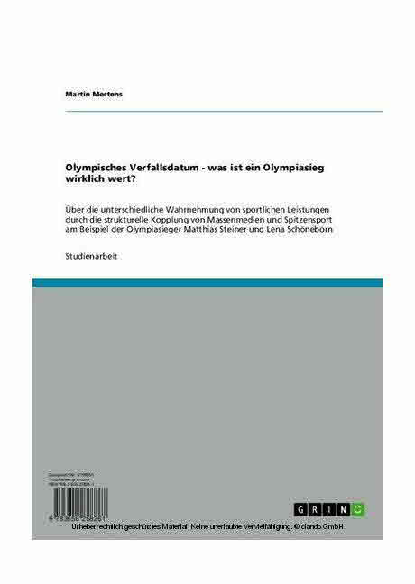 Olympisches Verfallsdatum - was ist ein Olympiasieg wirklich wert? Über die unterschiedliche Wahrnehmung von sportlichen Leistungen durch strukturelle Kopplung von Massenmedien und Spitzensport am Beispiel der Olympiasieger Matthias Steiner und Lena Schöneborn