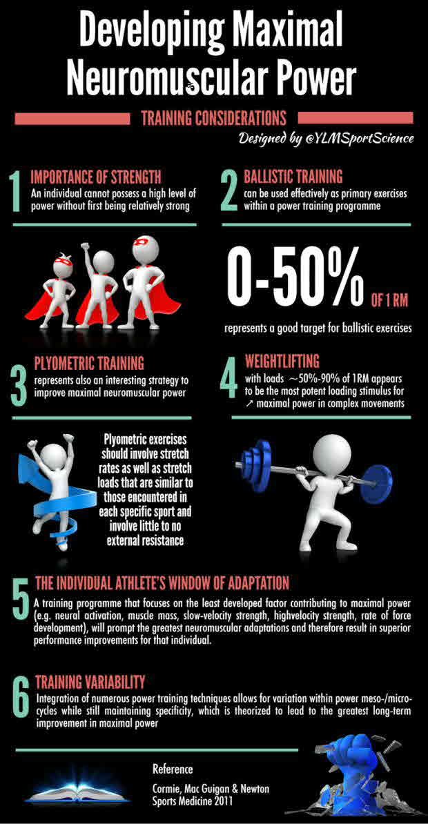 This series of reviews focuses on the most important neuromuscular function in many sport performances, the ability to generate maximal muscular power. Part 1 focuses on the factors that affect maximal power production, while part 2, which will follow in a forthcoming edition of Sports Medicine, explores the practical application of these findings by reviewing the scientific literature relevant to the development of training programmes that most effectively enhance maximal power production. The ability of the neuromuscular system to generate maximal power is affected by a range of interrelated factors. Maximal muscular power is defined and limited by the force-velocity relationship and affected by the length-tension relationship. The ability to generate maximal power is influenced by the type of muscle action involved and, in particular, the time available to develop force, storage and utilization of elastic energy, interactions of contractile and elastic elements, potentiation of contractile and elastic filaments as well as stretch reflexes. Furthermore, maximal power production is influenced by morphological factors including fibre type contribution to whole muscle area, muscle architectural features and tendon properties as well as neural factors including motor unit recruitment, firing frequency, synchronization and inter-muscular coordination. In addition, acute changes in the muscle environment (i.e. alterations resulting from fatigue, changes in hormone milieu and muscle temperature) impact the ability to generate maximal power. Resistance training has been shown to impact each of these neuromuscular factors in quite specific ways. Therefore, an understanding of the biological basis of maximal power production is essential for developing training programmes that effectively enhance maximal power production in the human.