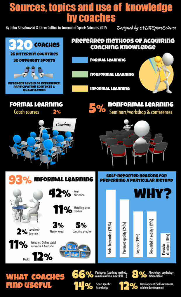 In recent years, the value of social learning approaches as part of the design and delivery of formalised coach development initiatives has gained credence in the literature. However, insight is currently lacking into the fundamental social dimensions that underpin coach learning. Accordingly, this study aimed to explore coaches` perceptions of their actual and preferred methods of acquiring new coaching knowledge, the types of knowledge they currently acquire and/or desire, and their application of new knowledge. Responses to an online survey, completed by practicing coaches (N = 320) in a range of sports and contexts, were analysed descriptively and inductively. Results revealed that coaches preferred, and mostly acquired, coaching knowledge from informal learning activities, especially when these permitted social interaction. Notably, however, formal coach education courses were also reported relatively frequently as a source of recent knowledge acquisition. Nevertheless, critical justification for and application of acquired knowledge was largely absent. Based on the findings, we suggest that, before social learning activities such as mentoring schemes and communities of practice are placed at the centre of formalised coach development provision, coach educators must put in place the support structures to better enable coaches to recognise and deal with the potentially mixed influences of the social milieu on coach learning, aiming to ensure that their informal development is sufficiently open-minded, reflective and critical.