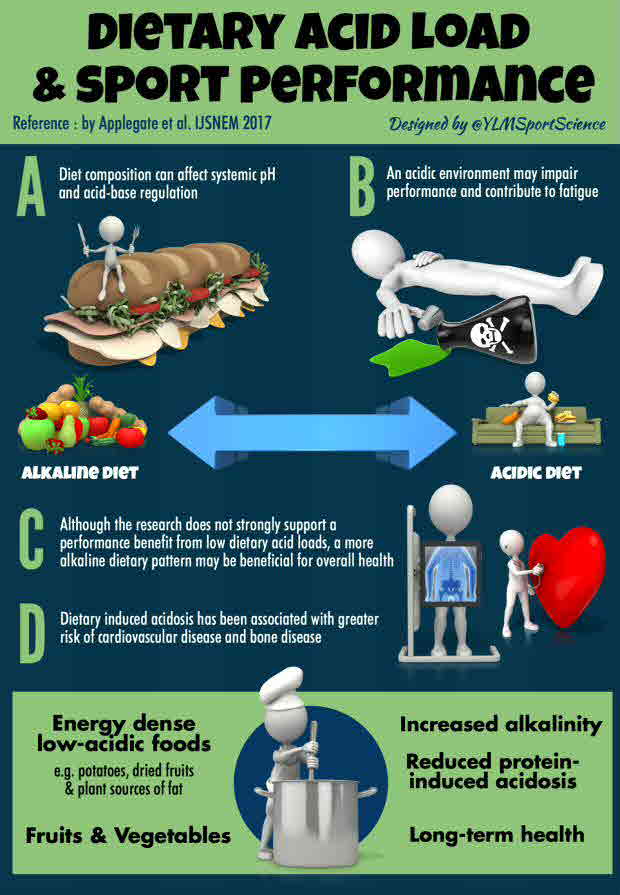 Diet composition can affect systemic pH and acid-base regulation, which may in turn influence exercise performance. An acidic environment in the muscle impairs performance and contributes to fatigue; therefore, current trends in sports nutrition place importance on maximizing the alkalinity of the body with ergogenic aids and dietary strategies. This review examines the evidence on the effects of dietary manipulations on acid load and exercise performance. Ten studies that investigated the effect of high versus low dietary acid loads on athletic performance generally identified that low dietary acid loads increased plasma pH, but did not consistently improve exercise performance at maximal or submaximal exercise intensities. In addition, the few studies conducted have several limitations including lack of female subjects and use of exercise tests exclusive to cycling or treadmill running. Although the research does not strongly support a performance benefit from low dietary acid loads, a more alkaline dietary pattern may be beneficial for overall health, as dietary induced acidosis has been associated with greater risk of cardiovascular disease and bone disease. The review includes dietary recommendations for athletes to reduce dietary acid load while still meeting sports nutrition recommendations