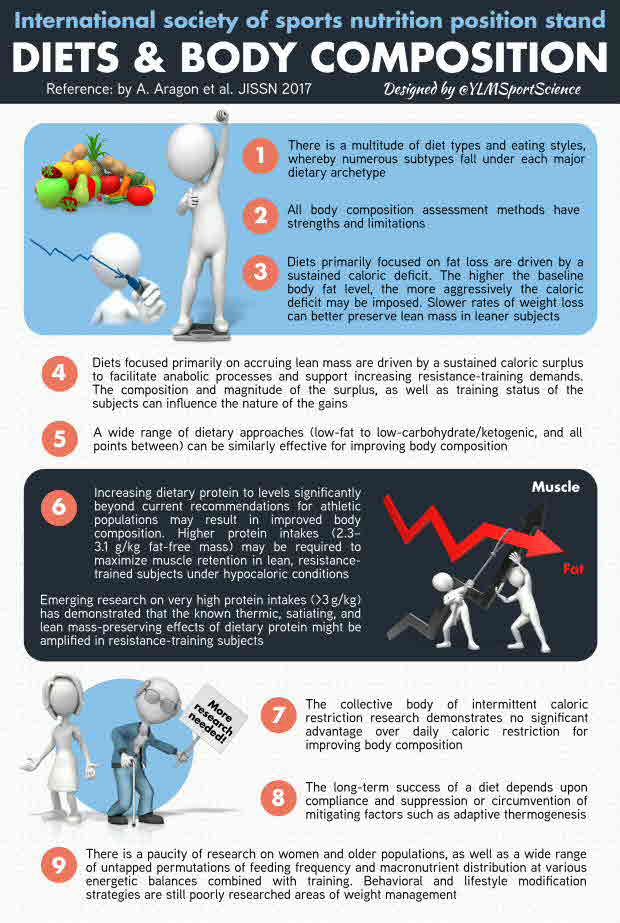 Position Statement: The International Society of Sports Nutrition (ISSN) bases the following position stand on a critical analysis of the literature regarding the effects of diet types (macronutrient composition; eating styles) and their influence on body composition. The ISSN has concluded the following. 1) There is a multitude of diet types and eating styles, whereby numerous subtypes fall under each major dietary archetype. 2) All body composition assessment methods have strengths and limitations. 3) Diets primarily focused on fat loss are driven by a sustained caloric deficit. The higher the baseline body fat level, the more aggressively the caloric deficit may be imposed. Slower rates of weight loss can better preserve lean mass (LM) in leaner subjects. 4) Diets focused primarily on accruing LM are driven by a sustained caloric surplus to facilitate anabolic processes and support increasing resistance-training demands. The composition and magnitude of the surplus, as well as training status of the subjects can influence the nature of the gains. 5) A wide range of dietary approaches (low-fat to low-carbohydrate/ketogenic, and all points between) can be similarly effective for improving body composition. 6) Increasing dietary protein to levels significantly beyond current recommendations for athletic populations may result in improved body composition. Higher protein intakes (2.3-3.1 g/kg FFM) may be required to maximize muscle retention in lean, resistance-trained subjects under hypocaloric conditions. Emerging research on very high protein intakes (>3 g/kg) has demonstrated that the known thermic, satiating, and LM-preserving effects of dietary protein might be amplified in resistance-training subjects. 7) The collective body of intermittent caloric restriction research demonstrates no significant advantage over daily caloric restriction for improving body composition. 8) The long-term success of a diet depends upon compliance and suppression or circumvention of mitigating factors such as adaptive thermogenesis. 9) There is a paucity of research on women and older populations, as well as a wide range of untapped permutations of feeding frequency and macronutrient distribution at various energetic balances combined with training. Behavioral and lifestyle modification strategies are still poorly researched areas of weight management.