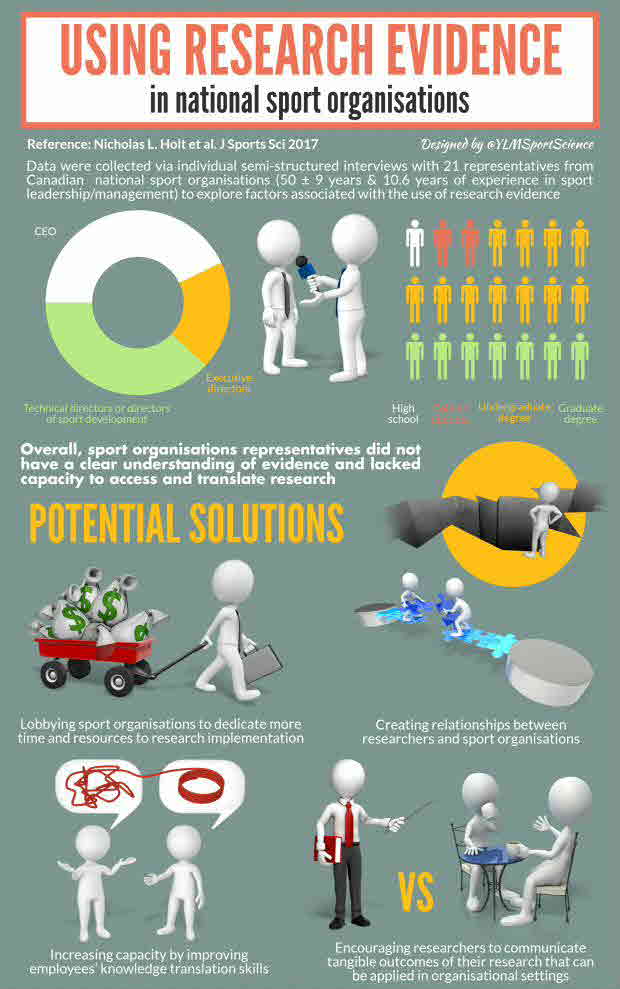 The purpose of this study was to explore factors associated with the use of research evidence in Canadian National Sport Organisations (NSOs). Data were collected via individual semi-structured interviews with 21 representatives from Canadian NSOs. A qualitative description approach was used. Interviews were transcribed verbatim and subjected to an inductive-to-deductive thematic analysis. A research implementation framework (Rycroft-Malone, 2004) was used to organise inductively derived themes into the higher-order categories of evidence (use of evidence, disconnection between research and practice), context (lack of capacity, organisational structure), and facilitation (personal connections with researchers and sport scientists, formal meetings with stakeholders). Overall, NSO representatives did not have a clear understanding of evidence and lacked capacity to access and translate research. However, some context factors, along with internal and external facilitators, were in place and could be used to enhance research implementation. Abstract from author