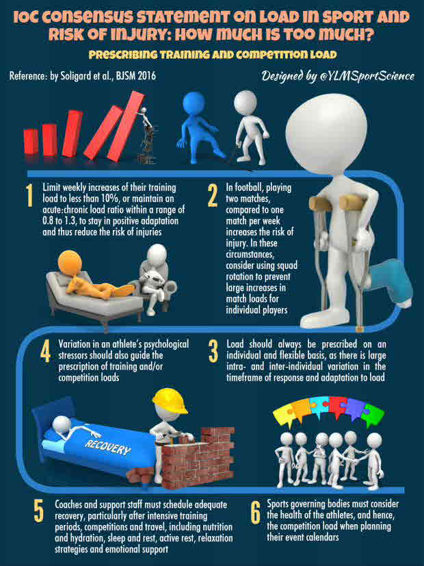 The modern-day athlete participating in elite sports is exposed to high training loads and increasingly saturated competition calendar. Emerging evidence indicates that inappropriate load management is a significant risk factor for acute illness and the overtraining syndrome. The IOC convened an expert group to review the scientific evidence for the relationship of load—including rapid changes in training and competition load, competition calendar congestion, psychological load and travel—and health outcomes in sport. This paper summarises the results linking load to risk of illness and overtraining in athletes, and provides athletes, coaches and support staff with practical guidelines for appropriate load management to reduce the risk of illness and overtraining in sport. These include guidelines for prescription of training and competition load, as well as for monitoring of training, competition and psychological load, athlete well-being and illness. In the process, urgent research priorities were identified.