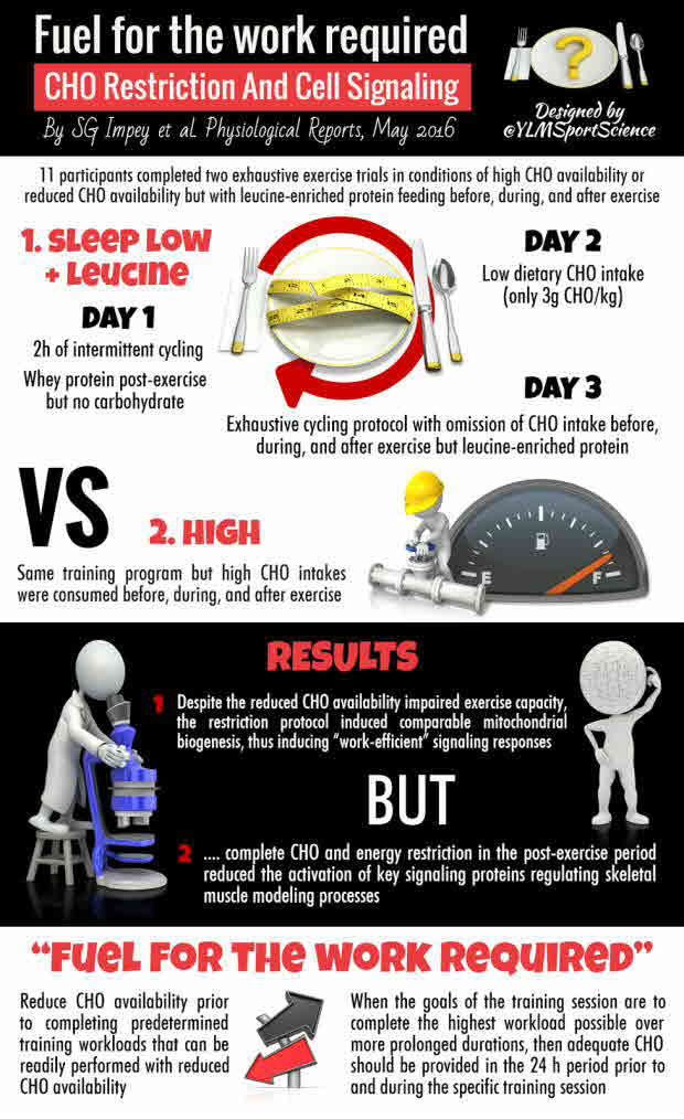Using an amalgamation of previously studied "train-low" paradigms, we tested the effects of reduced carbohydrate (CHO) but high leucine availability on cell-signaling responses associated with exercise-induced regulation of mitochondrial biogenesis and muscle protein synthesis (MPS). In a repeated-measures crossover design, 11 males completed an exhaustive cycling protocol with high CHO availability before, during, and after exercise (HIGH) or alternatively, low CHO but high protein (leucine enriched) availability (LOW + LEU). Muscle glycogen was different (P < 0.05) pre-exercise (HIGH: 583 ± 158, LOW + LEU: 271 ± 85 mmol kg-1 dw) but decreased (P < 0.05) to comparable levels at exhaustion (˜100 mmol kg-1 dw). Despite differences (P < 0.05) in exercise capacity (HIGH: 158 ± 29, LOW + LEU: 100 ± 17 min), exercise induced (P < 0.05) comparable AMPKa2 (3-4-fold) activity, PGC-1a (13-fold), p53 (2-fold), Tfam (1.5-fold), SIRT1 (1.5-fold), Atrogin 1 (2-fold), and MuRF1 (5-fold) gene expression at 3 h post-exercise. Exhaustive exercise suppressed p70S6K activity to comparable levels immediately post-exercise (˜20 fmol min-1 mg-1). Despite elevated leucine availability post-exercise, p70S6K activity remained suppressed (P < 0.05) 3 h post-exercise in LOW + LEU (28 ± 14 fmol min-1 mg-1), whereas muscle glycogen resynthesis (40 mmol kg-1 dw h-1) was associated with elevated (P < 0.05) p70S6K activity in HIGH (53 ± 30 fmol min-1 mg-1). We conclude: (1) CHO restriction before and during exercise induces "work-efficient" mitochondrial-related cell signaling but; (2) post-exercise CHO and energy restriction maintains p70S6K activity at basal levels despite feeding leucine-enriched protein. Our data support the practical concept of "fuelling for the work required" as a potential strategy for which to amalgamate train-low paradigms into periodized training programs.
