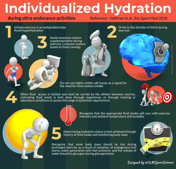 It is not unusual for those participating in ultra-endurance (> 4 hr) events to develop varying degrees of either hypohydration or hyperhydration. Yet, it is important for ultra-endurance athletes to avoid the performance limiting and potentially fatal consequences of these conditions. During short periods of exercise (< 1 hr), trivial effects on the relationship between body mass change and hydration status result from body mass loss due to oxidation of endogenous fuel stores, and water supporting the intravascular volume being generated from endogenous fuel oxidation and released with glycogen oxidation. However, these effects have meaningful implications during prolonged exercise. In fact, body mass loses well over 2% may be required during some ultra-endurance activities to avoid hyperhydration. Therefore, the typical hydration guidelines to avoid more than 2% body mass loss do not apply in ultra-endurance activities and can potentially result in hyperhydration. Fortunately, achieving the balance of proper hydration during ultra-endurance activities need not be complicated and has been well demonstrated to generally be achieved by simply drinking to thirst and avoiding excessive sodium supplementation with intention of replacing all sodium losses during the exercise. Abstract from author