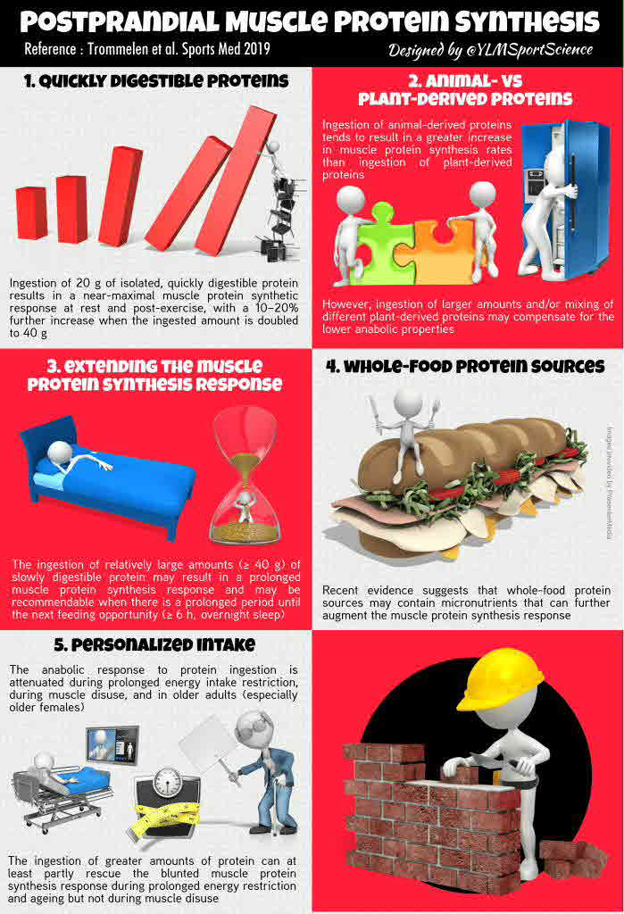 Protein ingestion following resistance-type exercise stimulates muscle protein synthesis rates and consequently enhances the skeletal muscle adaptive response to prolonged training. Ingestion of?~?20 g of quickly digestible protein isolate optimizes muscle protein synthesis rates during the first few hours of post-exercise recovery. However, the majority of daily protein intake is consumed as slower digestible, nutrient-rich, whole-food protein sources as part of mixed meals. Therefore, the muscle protein synthetic response to the ingestion of protein supplements and typical foods or mixed meals may differ substantially. In addition, the muscle protein synthetic response to feeding is not only determined by acute nutrient intake but is also likely modulated by habitual energy and nutrient intake and nondietary factors such as habitual physical activity, body composition, age, and/or sex. Therefore, nutritional recommendations to maximize the muscle protein synthetic response to exercise depend on the type of meal (e.g., protein supplements vs. mixed meals) and the time until the next feeding opportunity (e.g., feeding before overnight sleep) and, therefore, need to be personalized to the individual athlete.