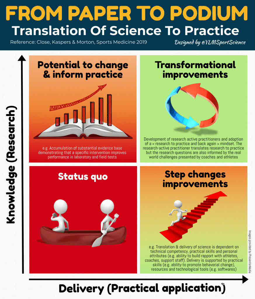 Sport nutrition is one of the fastest growing and evolving disciplines of sport and exercise science, demonstrated by a 4-fold increase in the number of research papers between 2012 and 2018. Indeed, the scope of contemporary nutrition-related research could range from discovery of novel nutrient-sensitive cell-signalling pathways to the assessment of the effects of sports drinks on exercise performance. For the sport nutrition practitioner, the goal is to translate innovations in research to develop and administer practical interventions that contribute to the delivery of winning performances. Accordingly, step one in the translation of research to practice should always be a well-structured critique of the translational potential of the existing scientific evidence. To this end, we present an operational framework (the "Paper-2-Podium Matrix") that provides a checklist of criteria for which to prompt the critical evaluation of performance nutrition-related research papers. In considering the (1) research context, (2) participant characteristics, (3) research design, (4) dietary and exercise controls, (5) validity and reliability of exercise performance tests, (6) data analytics, (7) feasibility of application, (8) risk/reward and (9) timing of the intervention, we aimed to provide a time-efficient framework to aid practitioners in their scientific appraisal of research. Ultimately, it is the combination of boldness of reform (i.e. innovations in research) and quality of execution (i.e. ease of administration of practical solutions) that is most likely to deliver the transition from paper to podium.