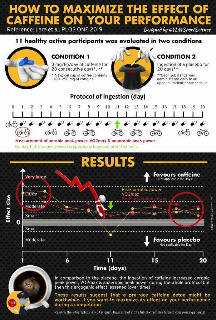 The ergogenic effect of acute caffeine ingestion has been widely investigated; however, scientific information regarding tolerance to the performance benefits of caffeine, when ingested on a day-to-day basis, is scarce. The aim of this investigation was to determine the time course of tolerance to the ergogenic effects of a moderate dose of caffeine. Eleven healthy active participants took part in a cross-over, double-blind, placebo-controlled experiment. In one treatment, they ingested 3 mg/kg/day of caffeine for 20 consecutive days while in another they ingested a placebo for 20 days. Each substance was administered daily in an opaque unidentifiable capsule, and the experimental trials started 45 min after capsule ingestion. Two days before, and three times per week during each 20-day treatment, aerobic peak power was measured with an incremental test to volitional fatigue (25 W/min) and aerobic peak power was measured with an adapted version of the Wingate test (15 s). In comparison to the placebo, the ingestion of caffeine increased peak cycling power in the incremental exercise test by ~4.0 ±1.3% for the first 15 days (P<0.05) but then this ergogenic effect lessened. Caffeine also increased peak cycling power during the Wingate test on days 1, 4, 15, and 18 of ingestion by ~4.9 ±0.9% (P<0.05). In both tests, the magnitude of the ergogenic effect of caffeine vs. placebo was higher on the first day of ingestion and then progressively decreased. These results show a continued ergogenic effect with the daily ingestion of caffeine for 15-18 days; however, the changes in the magnitude of this effect suggest progressive tolerance.