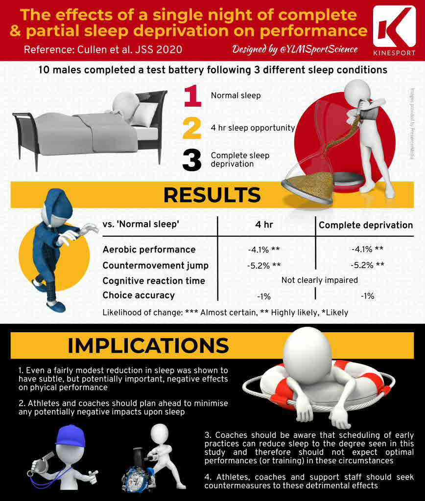 This study investigated the effects of complete and partial sleep deprivation on multiple aspects of athletic performance. Ten males completed a cognitive function test, maximal handgrip strength, countermovement jump (CMJ) and a 15 min all out cycling test to assess aerobic performance. These tests were performed following 3 different sleep conditions; normal sleep (CON), a 4 hr sleep opportunity (PART) and complete sleep deprivation (DEP). Data were analysed using a Bayesian multi-level regression model to provide probabilities of impairment (p = %). Aerobic performance, CMJ and handgrip strength were impaired by 11.4% (p = 100%), 10.9% (p = 100%) and 6% (p = 97%) following DEP, while aerobic performance and CMJ were highly likely impaired by 4.1% (p = 90%) and 5.2% (p = 94%) following PART. Cognitive reaction time was not impacted by PART or DEP. In contrast the accuracy of responses was highly likely impaired by 2% (91) following DEP, while there was less certainty of impaired accuracy following PART (-1%, p = 73). Multiple aspects of physical and cognitive performance were impacted by sleep deprivation. The greatest detrimental effects were seen for aerobic performance and CMJ. Partial sleep deprivation equating to 4 hrs of sleep causes subtle, but potentially important negative impairments on athletic performance.