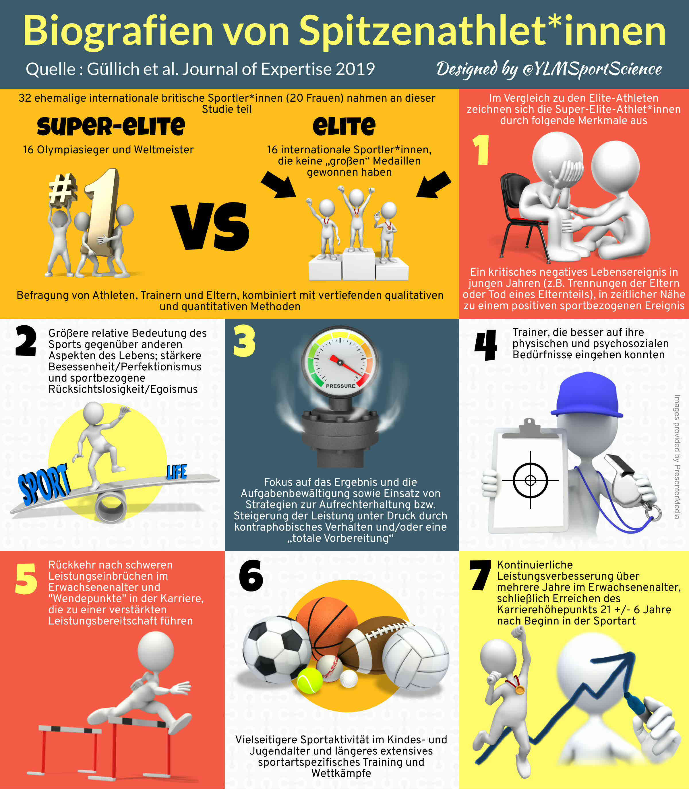 This multidisciplinary study used pattern recognition analyses to examine the developmental biographies of 16 Great British Olympic and World Champions ("Super-Elite") and 16 matched international athletes who had not won major medals ("Elite"). Athlete, coach and parent interviews (260 total interview hours) combined in-depth qualitative and quantitative methods. A combination of demographics, psychosocial characteristics, coach and family relationships, practice, competition, and performance development discriminated Super-Elite from Elite athletes with > 90% accuracy. Compared to Elite athletes, Super-Elite athletes were characterized by: (1) An early critical negative life experience in close proximity to significant positive sport-related events; (2) higher relative importance of sport over other aspects of life, stronger obsessiveness/perfectionism, and sport-related ruthlessness/selfishness; (3) conjoint outcome and mastery focus, and use of counterphobic and/or "total preparation"strategies to maintain/enhance performance under pressure; (4) coaches who better met their physical and psychosocial needs; (5) coming back after severe performance setbacks during adulthood, and career "turning points"leading to enhanced determination to excel; (6) more pronounced diversified youth sport engagement, and prolonged extensive sport-specific practice and competitions; and (7) continued performance improvement over more years during adulthood, eventually attaining their (first) gold medal after 21 ± 6 practice years. The findings are discussed relative to potential causal interactions and theoretical implications.