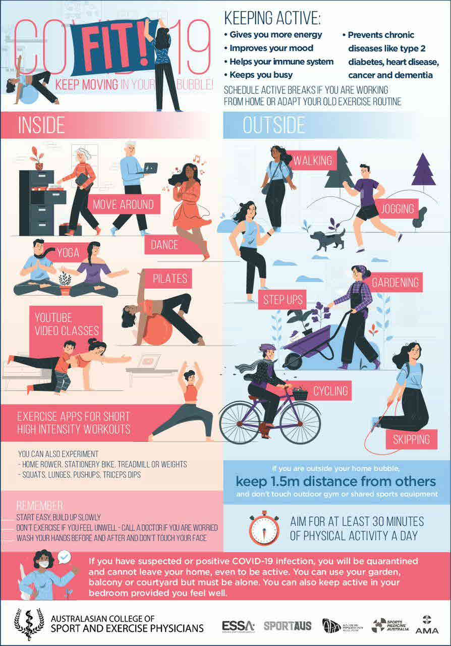 In this rapidly changing landscape, patients, their general practitioners, specialists and health organisations are suddenly faced with the need to assist patients adapt to exercise in these restrictive conditions. The Australasian College of Sport and Exercise Physicians in collaboration with Exercise and Sports Science Australia, the Australian Physiotherapy Association, Sports Medicine Australia, the Australian Medical Association and Sport Australia has developed an infographic toolkit to help with exercise prescription during the pandemic. The toolkit has three sets of advice related to children, teenagers and the adult population.