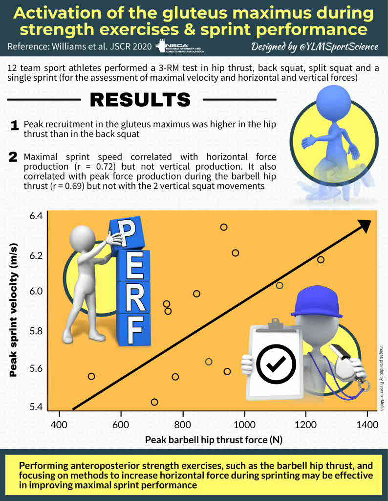The purpose of this research was to compare muscle activation of the gluteus maximus and ground reaction force between the barbell hip thrust, back squat, and split squat and to determine the relationship between these outcomes and vertical and horizontal forces during maximal sprinting. Twelve, male, team sport athletes (age, 25.0 ± 4.0 years; stature, 184.1 ± 6.0 cm; body mass, 82.2 ± 7.9 kg) performed separate movements of the 3 strength exercises at a load equivalent to their individual 3 repetition maximum. The ground reaction force was measured using force plates and the electromyography (EMG) activity of the upper and lower gluteus maximus and was recorded in each leg and expressed as percentage of the maximum voluntary isometric contraction (MVIC). Subjects then completed a single sprint on a nonmotorized treadmill for the assessment of maximal velocity and horizontal and vertical forces. Although ground reaction force was lower, peak EMG activity in the gluteus maximus was higher in the hip thrust than in the back squat (p = 0.024; 95% confidence interval [CI] = 4-56% MVIC) and split squat (p = 0.016; 95% CI = 6-58% MVIC). Peak sprint velocity correlated with both anterior-posterior horizontal force (r = 0.72) and peak ground reaction force during the barbell hip thrust (r = 0.69) but no other variables. The increased activation of gluteus maximus during the barbell hip thrust and the relationship with maximal running speed suggests that this movement may be optimal for training this muscle group in comparison to the back squat and split squat.
