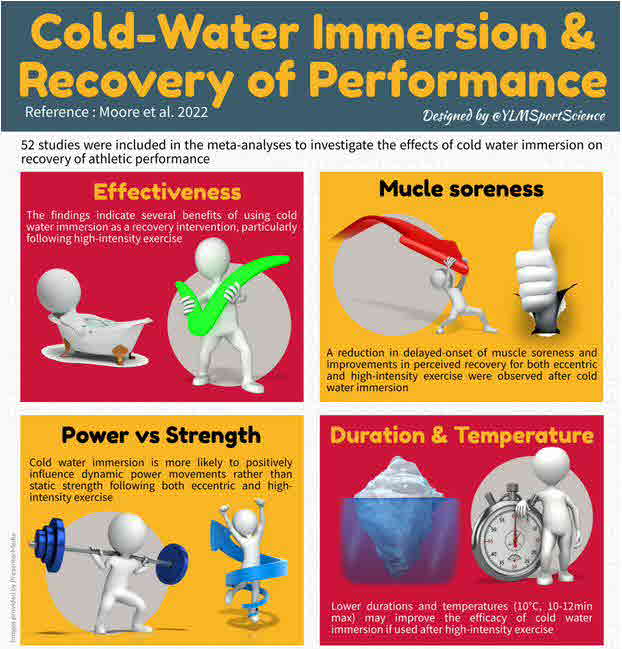 Results: Fifty-two studies were included in the meta-analyses. CWI improved the recovery of muscular power 24 h after eccentric exercise (SMD 0.34 [95% CI 0.06-0.62]) and after high-intensity exercise (SMD 0.22 [95% CI 0.004-0.43]), and reduced serum CK (SMD - 0.85 [95% CI - 1.61 to - 0.08]) 24 h after high-intensity exercise. CWI also improved muscle soreness (SMD - 0.89 [95% CI - 1.48 to - 0.29]) and perceived feelings of recovery (SMD 0.66 [95% CI 0.29-1.03]) 24 h after high-intensity exercise. There was no significant influence on the recovery of strength performance following either eccentric or high-intensity exercise. Meta-regression indicated that shorter time and lower temperatures were related to the largest beneficial effects on serum CK (duration and temperature dose effects) and endurance performance (duration dose effects only) after high-intensity exercise.