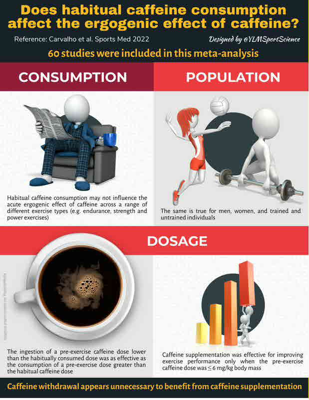 Methods: Three databases were searched, and articles screened according to inclusion/exclusion criteria. Three-level meta-analyses and meta-regression models were used to investigate the influence of habitual caffeine consumption on caffeine`s overall ergogenic effect and within different exercise types (endurance, power, strength), in men and women, and in trained and untrained individuals. Sub-analyses were performed according to the following: acute relative dose (< 3, 3-6, > 6 mg/kg body mass [BM]); whether the acute caffeine dose provided was lower or higher than the mean daily caffeine dose; and the caffeine withdrawal period prior to the intervention (< 24, 24-48, > 48 h).