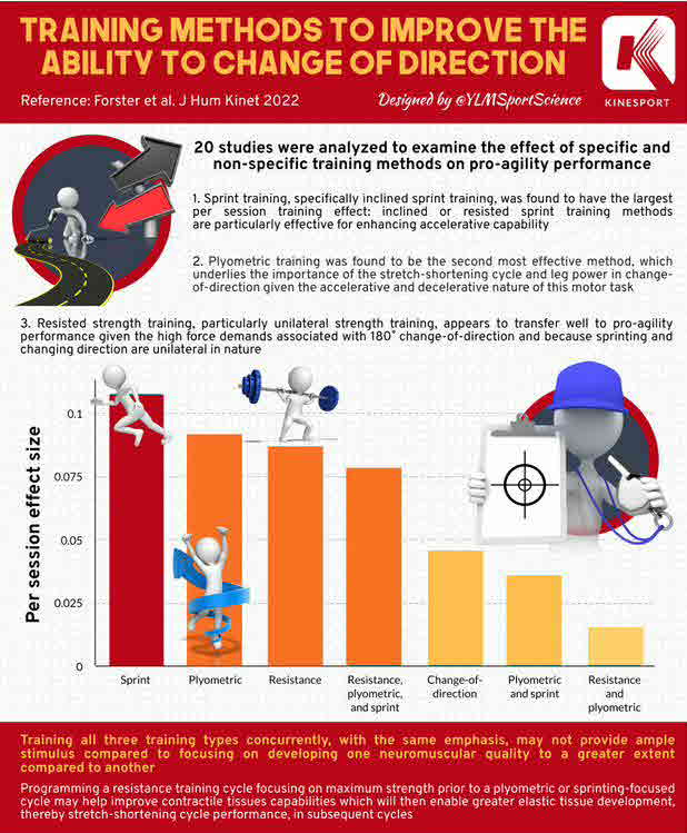 Effective directional change in sport is imperative to success in key game situations. Change of direction (COD) ability is underpinned by various athletic qualities which can be developed through specific and non-specific training methods. This review examined the effect of specific and non-specific training methods on pro-agility performance, by analysing the intervention type and resulting magnitude of training effects on pro-agility shuttle performance. A total of 20 studies were included for review. Data from 638 subjects and 29 intervention groups involving seven different training methods were extracted and analysed in relation to training method classification and primary outcome measures. Interventions involving sprint training, plyometric training, resistance training, and combined resistance, plyometric, and sprint training were found to produce statistically significant positive change on pro-agility performance per session (p < 0.05). Sprint training (0.108 ES), plyometric training (0.092 ES), resistance training (0.087 ES), and combined resistance, plyometric, and sprint training (0.078 ES) methods were found to have the highest per session training effect. While total time is the typical unit of measure for this test, different types of training may lead to preferential improvements in either acceleration, deceleration, or COD phases of the pro-agility shuttle. Specifically, resisted or inclined sprinting may develop the linear acceleration phases, unilateral resistance training may promote increased strength to overcome the imposed forces during the deceleration and COD phases, multiplanar plyometrics can help enhance stretch-shortening cycle capabilities across different force vectors, and a combination of two or more of these methods may enable simultaneous development of each of these qualities.