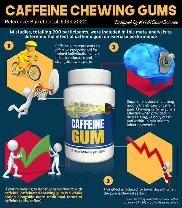 - This study determined the effect of Caff-gum on exercise performance, using a systematic review and meta-analysis. Fourteen studies, totalling 200 participants performing a variety of endurance and strength/power exercise tests were included. The relative Caff-gum dose ranged from 1.27-4.26 mg/kg BM and timing ranged from 120 min prior to exercise up to intra-test application.