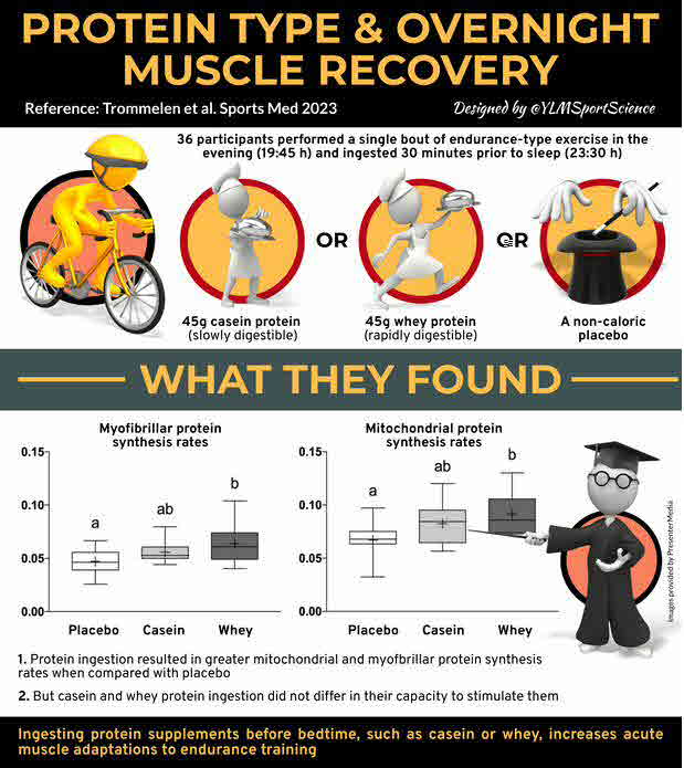 Conclusions: Protein ingestion prior to sleep increases both mitochondrial and myofibrillar protein synthesis rates during overnight recovery from exercise. The overnight muscle protein synthetic response to whey and casein protein does not differ.