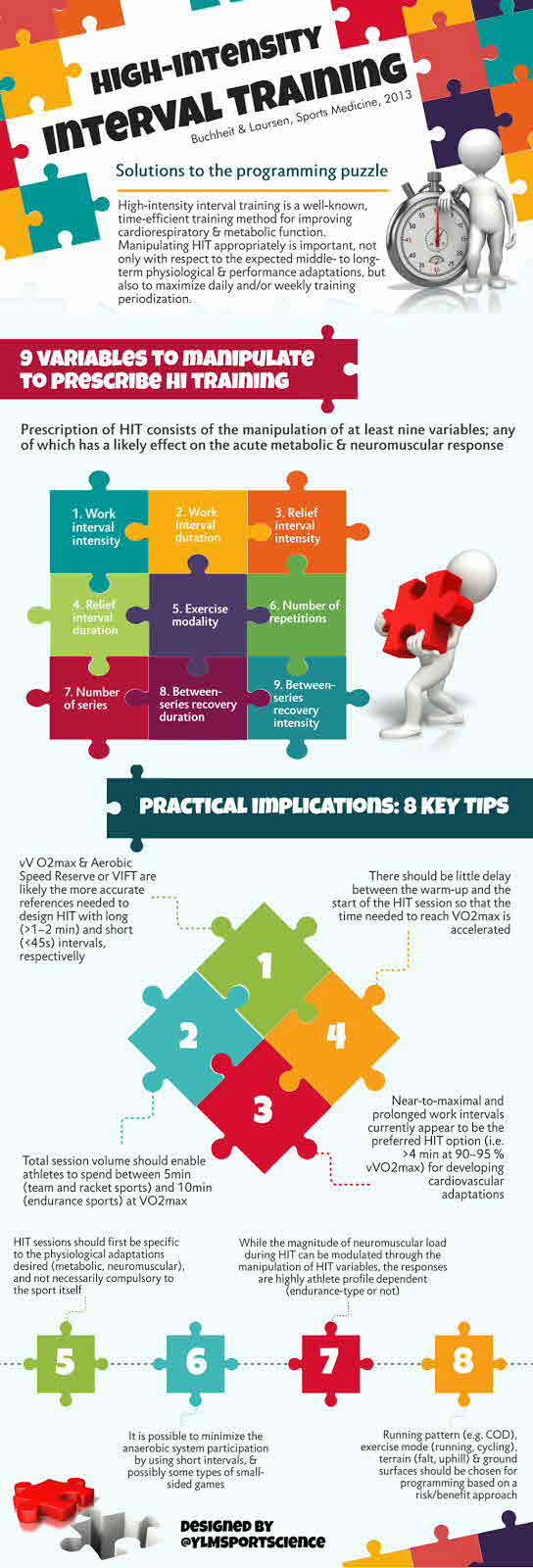 High-intensity interval training (HIT), in a variety of forms, is today one of the most effective means of improving cardiorespiratory and metabolic function and, in turn, the physical performance of athletes. HIT involves repeated short-to-long bouts of rather high-intensity exercise interspersed with recovery periods. For team and racquet sport players, the inclusion of sprints and all-out efforts into HIT programmes has also been shown to be an effective practice. It is believed that an optimal stimulus to elicit both maximal cardiovascular and peripheral adaptations is one where athletes spend at least several minutes per session in their `red zone,` which generally means reaching at least 90 % of their maximal oxygen uptake ( VO2max). While use of HIT is not the only approach to improve physiological parameters and performance, there has been a growth in interest by the sport science community for characterizing training protocols that allow athletes to maintain long periods of time above 90 % of VO2max (T@ VO2max). In addition to T@ VO2max, other physiological variables should also be considered to fully characterize the training stimulus when programming HIT, including cardiovascular work, anaerobic glycolytic energy contribution and acute neuromuscular load and musculoskeletal strain. Prescription for HIT consists of the manipulation of up to nine variables, which include the work interval intensity and duration, relief interval intensity and duration, exercise modality, number of repetitions, number of series, as well as the between-series recovery duration and intensity. The manipulation of any of these variables can affect the acute physiological responses to HIT. This article is Part I of a subsequent II-part review and will discuss the different aspects of HIT programming, from work/relief interval manipulation to the selection of exercise mode, using different examples of training cycles from different sports, with continued reference to T@ VO2max and cardiovascular responses. Additional programming and periodization considerations will also be discussed with respect to other variables such as anaerobic glycolytic system contribution (as inferred from blood lactate accumulation), neuromuscular load and musculoskeletal strain (Part II).