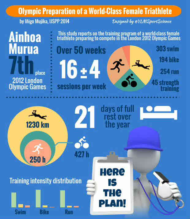 Detailed accounts of the training programs followed by today`s elite triathletes are lacking in the sport-science literature. This study reports on the training program of a world-class female triathlete preparing to compete in the London 2012 Olympic Games. Over 50 wk, she performed 796 sessions (303 swim, 194 bike, 254 run, 45 strength training), ie, 16 ± 4 sessions/wk (mean ± SD). Swim, bike, and run training volumes were, respectively, 1230 km (25 ± 8 km/wk), 427 h (9 ± 3 h/wk), and 250 h (5 ± 2 h/wk). Training tasks were categorized and prescribed based on heart-rate values and/or speeds and power outputs associated with different blood lactate concentrations. Training performed at intensities below her individual lactate threshold (ILT), between the ILT and the onset of blood lactate accumulation (OBLA), and above the OBLA for swim were 74% ± 6%, 16% ± 2%, 10% ± 2%; bike 88% ± 3%, 10% ± 1%, 2.1% ± 0.2%; and run 85% ± 2%, 8.0% ± 0.3%, 6.7% ± 0.3%. Training organization was adapted to the busy competition calendar (18 events, of which 8 were Olympic-distance triathlons) and continuously responded to emerging information. Training volumes were 35-80% higher than those previously reported for elite male and female triathletes, but training intensity and tapering strategies successfully followed recommended best practice for endurance athletes. This triathlete placed 7th in London 2012, and her world ranking improved from 14th to 8th at the end of 2012.