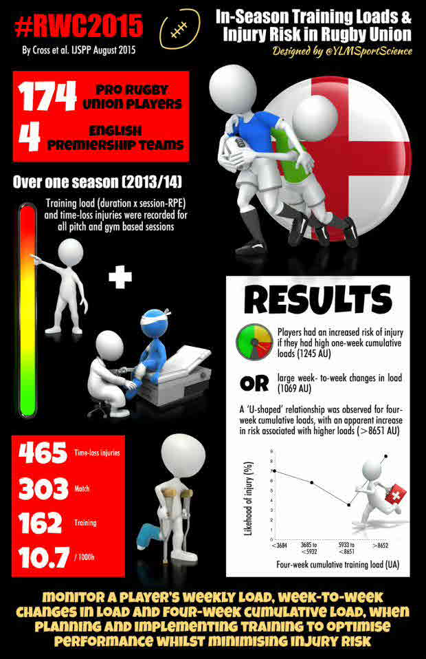 Purpose: To explore the association between in-season training-load (TL) measures and injury risk in professional rugby union players. Methods: This was a 1-season prospective cohort study of 173 professional rugby union players from 4 English Premiership teams. TL (duration × session-RPE) and time-loss injuries were recorded for all players for all pitch- and gym-based sessions. Generalized estimating equations were used to model the association between in-season TL measures and injury in the subsequent week. Results: Injury risk increased linearly with 1-wk loads and week-to-week changes in loads, with a 2-SD increase in these variables (1245 AU and 1069 AU, respectively) associated with odds ratios of 1.68 (95% CI 1.05-2.68) and 1.58 (95% CI 0.98-2.54). When compared with the reference group (<3684 AU), a significant nonlinear effect was evident for 4-wk cumulative loads, with a likely beneficial reduction in injury risk associated with intermediate loads of 5932-8651 AU (OR 0.55, 95% CI 0.22-1.38) (this range equates to around 4 wk of average in-season TL) and a likely harmful effect evident for higher loads of >8651 AU (OR 1.39, 95% CI 0.98-1.98). Conclusions: Players had an increased risk of injury if they had high 1-wk cumulative loads (1245 AU) or large week-to-week changes in TL (1069 AU). In addition, a U-shaped relationship was observed for 4-wk cumulative loads, with an apparent increase in risk associated with higher loads (>8651 AU). These measures should therefore be monitored to inform injury-risk-reduction strategies.